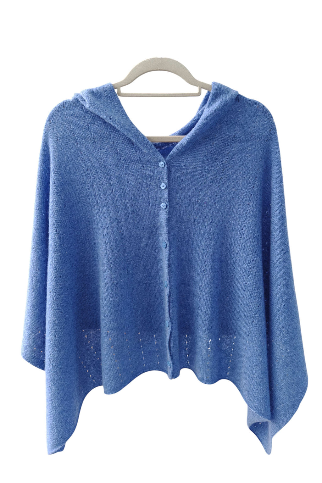 This cornflower blue cashmere poncho is wearable in any season, whether it's summer, spring, autumn or winter.