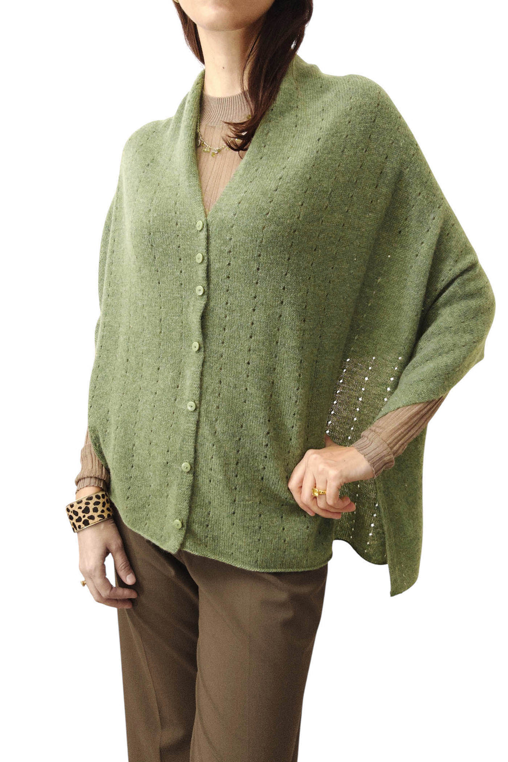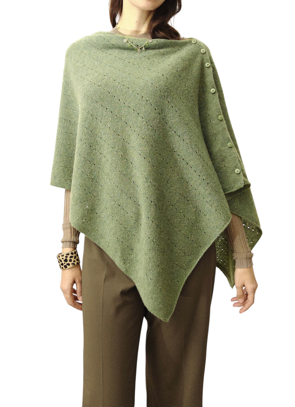 This light olive green cashmere poncho is wearable in any season, whether it's summer, spring, autumn or winter.